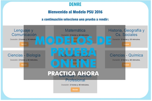 El Departamento de evaluación, medición y registro educacional (DEMRE) ha puesto a disposición modelos de PSU para rendir en linea. Una vez finalizada la Prueba, podrás obtener tu puntaje y acceder a una explicación de la respuesta correcta con la ficha curricular correspondiente.